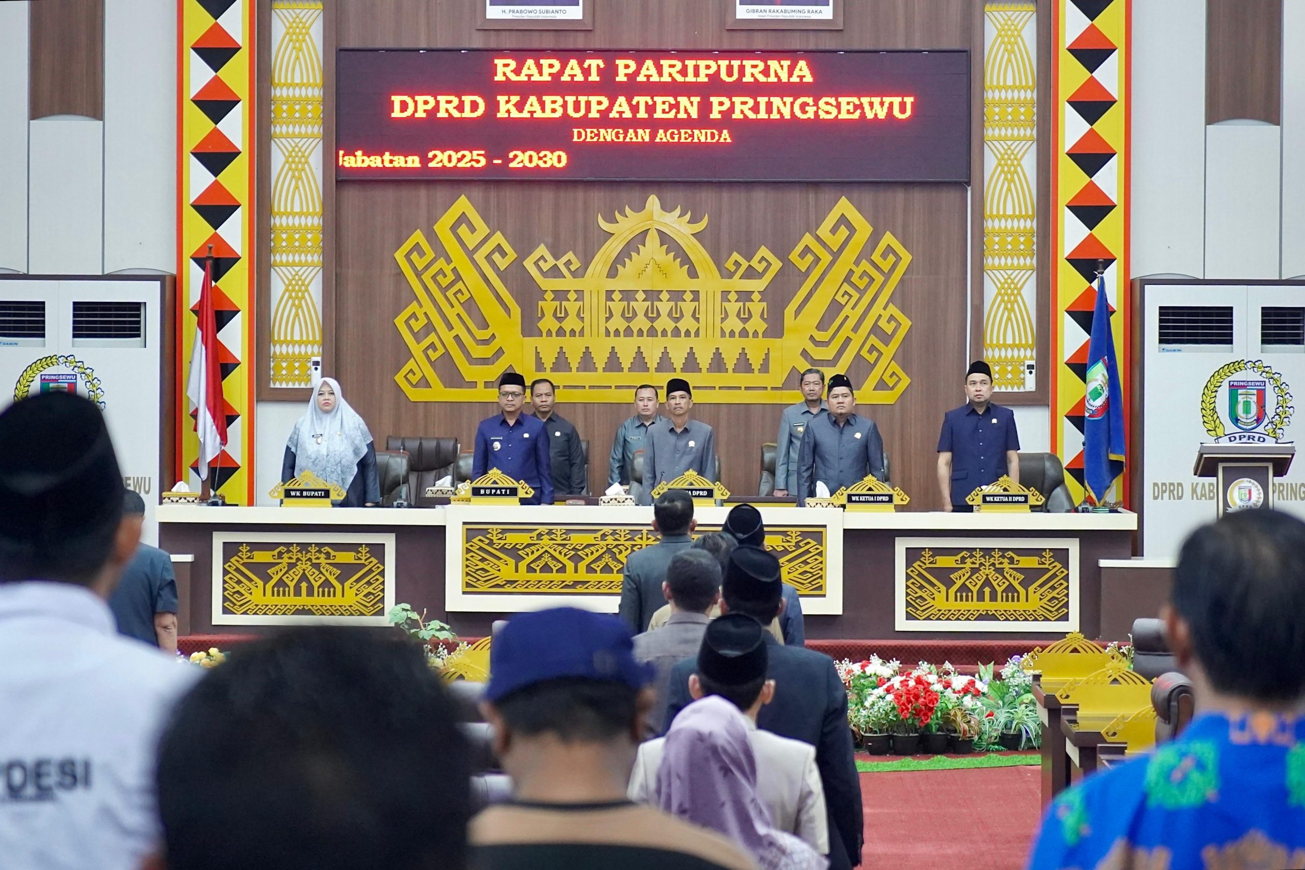 PRINGSEWU – Bupati Pringsewu Riyanto Pamungkas menyampaikan pidato perdana pada Rapat Paripurna DPRD Kabupaten Pringsewu di gedung DPRD setempat, Senin (3/3/2025). Rapat Paripurna yang diikuti 36 dari 40 anggota DPRD ini dipimpin Ketua DPRD Kabupaten Pringsewu Suherman, dihadiri Wakil Bupati Pringsewu Umi Laila beserta jajaran pemerintah daerah dan forkopimda serta berbagai elemen lainnya.