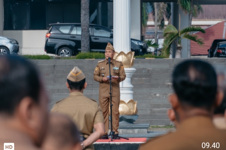 Bandar Lampung – Gubernur Lampung yang diwakili Staf Ahli bidang Pemerintahan, Hukum dan Politik, Achmad Saefulloh memimpin apel mingguan di lingkungan Sekretariat Daerah Provinsi Lampung, di Lapangan Korpri, Senin (13/10/2025).